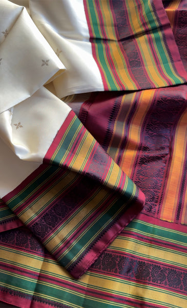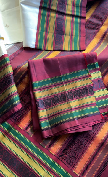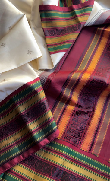 A classic handwoven Korvai Kanjivaram silk inspired from a vintage Kanjivaram saree with Kumaran color on the body with zari floral motifs contrasted with Korvai borders in old Arakku with colorful bands and Annam buttas. The pallu is laid with silken stripes and Annam buttas and accompanied by blouse piece in Arakku with same borders as the saree.